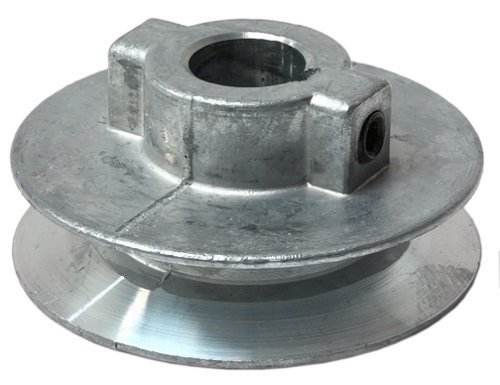 The Chicago die-cast, single V-grooved pulley is for A belts size 4L or 1/2 by 11/32 inches. Keyway has slotted headless set screw. Packed in Sta-Pak cartons. Dimensions: 2.38-inch diameter with 5/8-inch bore.